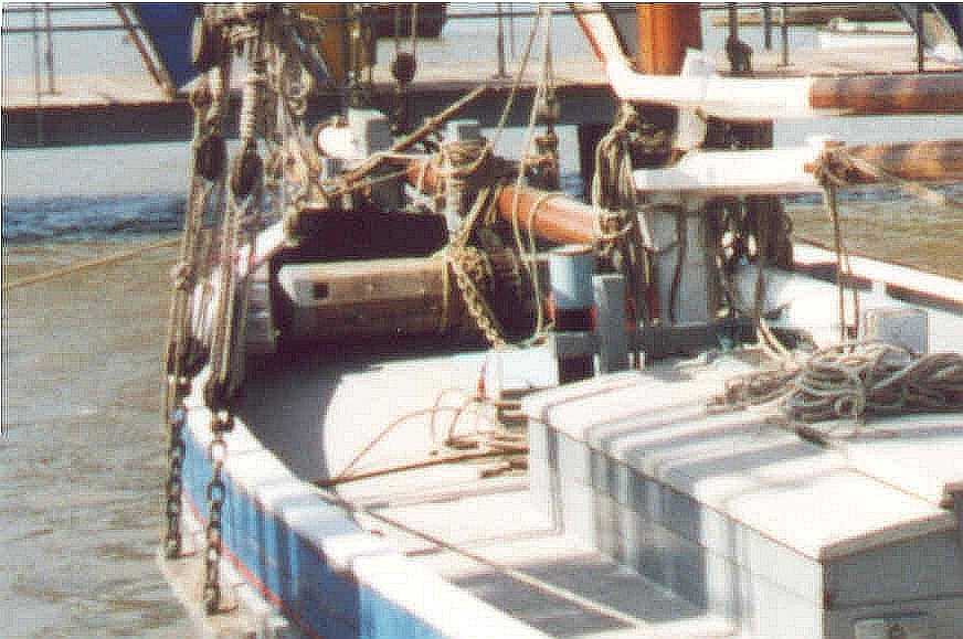 A close-up of the traditional windlass. The pawl is hinged behind the bitts and clinks over the toothed wheel in the middle of the barrel. A 4' spike is placed in the socket seen on the port side of the barrel and levered down, the pawl taking up the gain. A powerful system, cheap to make and easy to maintain with little to go wrong.