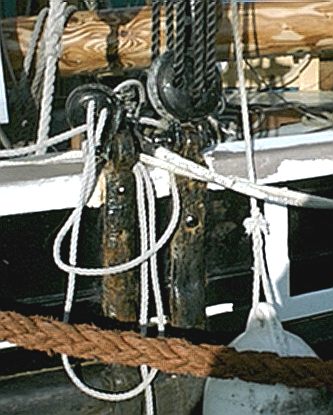 The left hand chain plate carries the topmast shroud tackle. Bawleys carry a bigger topsail on a taller topmast than a smack and their boomless main can be quickly brailed up to clear the decks. Lovely craft. Just two shrouds to the mast each side. Bowsprit run-in in the background on this pic taken during a lay-up work day. |